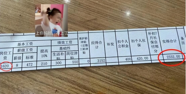 女幼师晒出"工资条",到手金额少得可怜,男友:还不如去当保姆