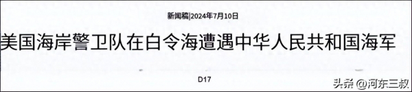 7月10日,美国海岸警卫队网站发布声明称,在阿拉斯加邻近白令海海域,发现至少4艘中国海军军舰。美方表示目前这4艘军舰还在国际海域,不过已经进入美国专属经济区,同时表示中国海军抵达这里符合国际规则和规范。虽然美方并没有指出具体型号,但从前段时间日报发表声明看,这支编队大概率就是055型拉萨舰带领,由052D型开封舰、054A型烟台舰,以及903A综合补给舰"可可西里湖"号组成。
