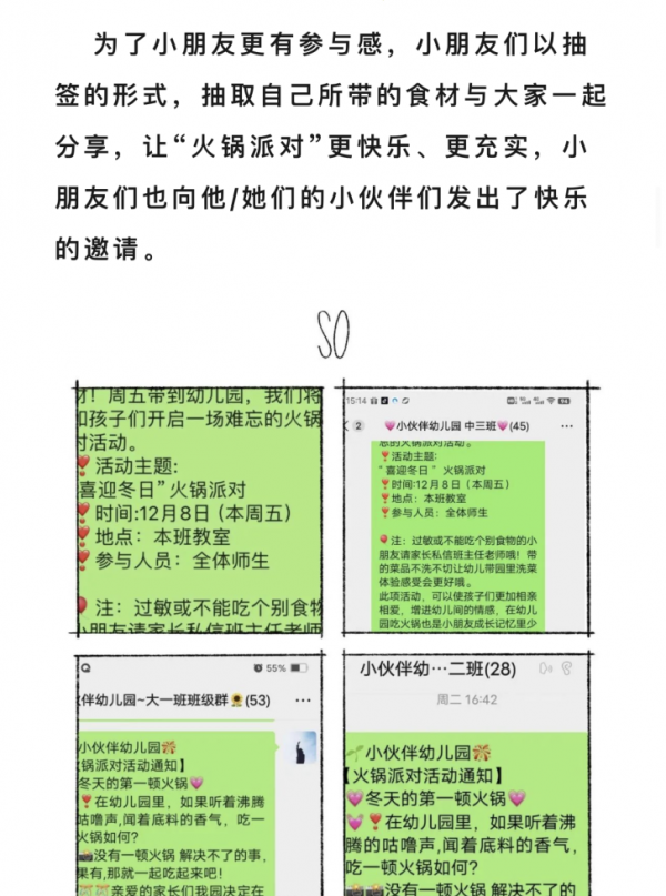 法治网记者搜索发现,这类幼儿园活动在各地均有开展,尤其在节日到来之际,除了水果分享、点心分享,还有抽签要求自带火锅食材等活动形式。例如在不久前的冬至,众多幼儿园就推出"冬至火锅宴"等相关活动。