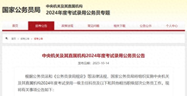 10月14日,中央机关及其直属机构2024年度考试录用公务员公告发布。