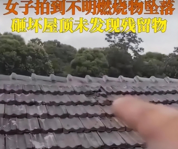 事情发生后,目击者爬上屋顶查看情况,发现屋顶有瓦片被砸坏,不过受损情况并不是很严重,并没有击穿屋顶,这说明这个燃烧物下坠的速度并不是很快。而从目击者分享出来的画面中,我们其实也可以看到这个不明物体掉下来时的过程,它看起来很像一个火团的物体,砸下来的时候速度其实比较慢的,似乎和我们扔出小石头的速度差不多而已。由于在现场目击者没有找到残留物,所以暂时不确定这个不明燃烧物到底是什么。