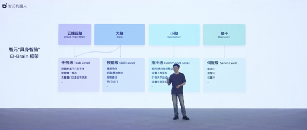 智元机器人研发了一套"具身智脑"EI-Brain框架,里面有机器人任务级、技能级、指令级和伺服级能力。