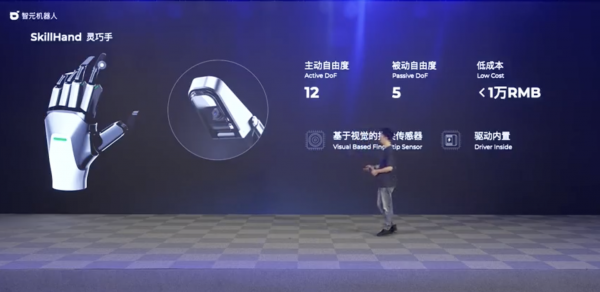 智元机器人还自研了机器人的灵巧手 SkillHand,拥有12个主动自由度和5个被动自由度,且成本不到1万元人民币。