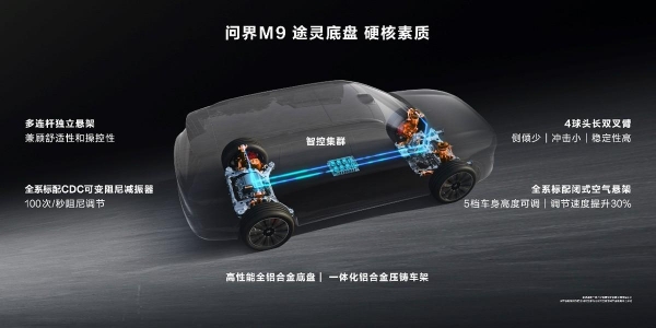 途灵智能底盘则是基于HUAWEI iDVP智能汽车数字平台,通过多模态融合感知系统、HUAWEI DATS动态自适应扭矩系统和HUAWEI xMotion智能车身协同控制系统,配合全系标配的智能闭式空气悬架和CDC可变阻尼减震器,用AI与软件能力将问界M9的机械素质充分发挥,提升了操控稳定性和舒适性。