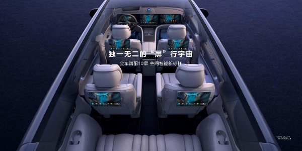 问界M9车内配备总共可达十块屏幕。前排有12.3英寸的液晶仪表盘、15.6英寸智能中控大屏和16英寸副驾娱乐屏组成的三联屏,第二、三排每个座位也都有独立的屏幕,并且在HarmonyOS 4的加持下,每块屏幕既可以独立控制,屏幕间又可以相互联动、流转、共享,搭配小桌板、平板、手机等设备,还可以变成不同的工作场景。车顶还设计了一块32英寸升降式投影幕布,后排乘客可以用来观影、游戏等等,甚至还可以用来遮阳。前挡玻璃上还有75英寸大画幅的HUAWEI ARHUD,能够实现AR实景导航。