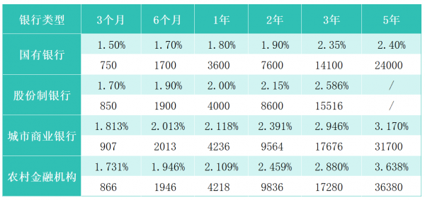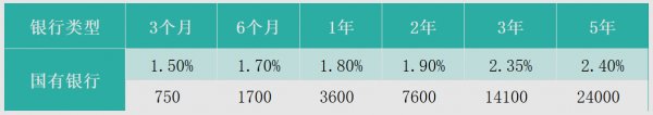 国有银行大额存单平均利率水平六个存期分别为:3个月1.5%、6个月1.7%、1年期1.8%、2年期1.9%、3年期2.35%、5年期2.4%。