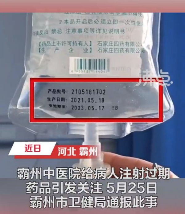 近日,有网友在社交平台发布视频,称河北霸州某医院在给病人输液时,使用的药品已经过期。患者输液的药品为葡萄糖氯化钠注射液,生产日期为 2021 年 5 月 18 日,有效期至 2023 年 5 月 17 日。