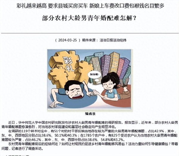 农村大龄男青年婚配难现象背后,既有结构性因素--性别比例失衡带来的适婚男女数量不均衡,也有社会心理层面的原因--攀比心态与从众心理相互交织,促使彩礼数额不断刷新纪录。在"面子文化"的驱使下,彩礼仿佛成了衡量男方家境与诚意的标尺,无形中加剧了经济竞争,使得婚恋市场偏离了情感本质,走入了一味追求物质的怪圈。