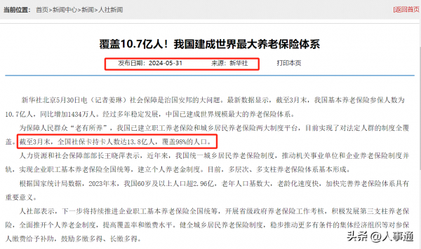 5月31日,根据人社部发布数据显示:截至3月末,我国养老保险参保人数为10.7亿人,全国社保卡持卡人数达13.8亿人,覆盖98%的人口。