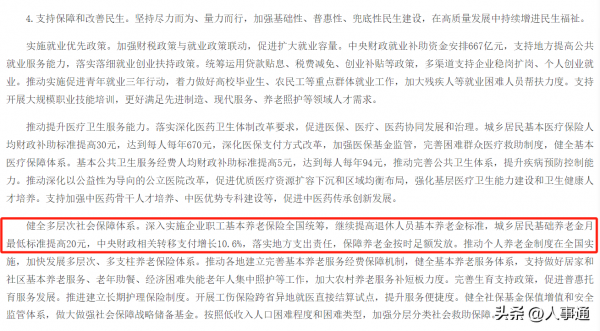 重点包括:健全多层次社会保障体系,实施企业养老保险统筹,继续提高退休人员的养老金,城乡居民基础养老金最低标准提高20元,中央财政相关转移支付增长10.6%,落实地方支出责任,保障养老金按时足额发放。