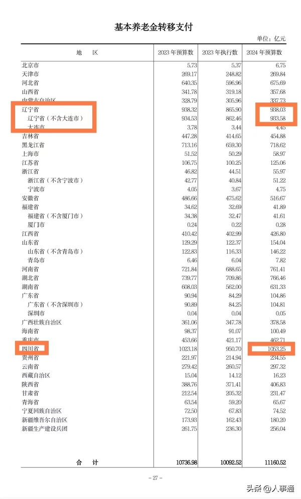 所谓养老金转移支付,主要包括企业职工养老保险补助经费、城乡居民基本养老保险补助经费和机关事业单位养老保险制度改革补助经费三部分。从2024年养老金转移支付预算来看:四川省的预算最高,为1053.25亿元,位列首位;辽宁省的预算位列次席,为938.03亿元。