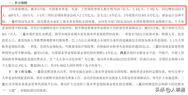 下一步:将持续实施企业职工基本养老保险全国统筹,确保养老金按时足额发放。持续推进社会保障卡居民服务"一卡通",积极拓展应用场景。