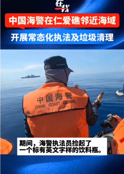 此外,5月18日,中国海警在中国仁爱礁邻近海域进行常态化巡航时,对海上漂浮的不可回收垃圾进行清理。其间,海警执法员捡起了一个标有"出口至菲律宾"等英文字样的饮料瓶。