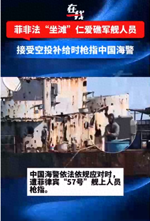央视新闻消息,5月19日,菲律宾对非法"坐滩"仁爱礁的"57号"军舰进行空投补给。中国海警依法依规应对时,发现菲"57号"舰上至少两名人员持枪在甲板活动,并用手、用枪指着中国海警方向。