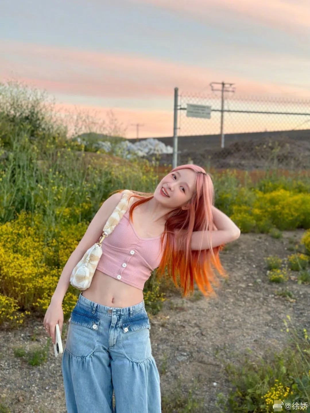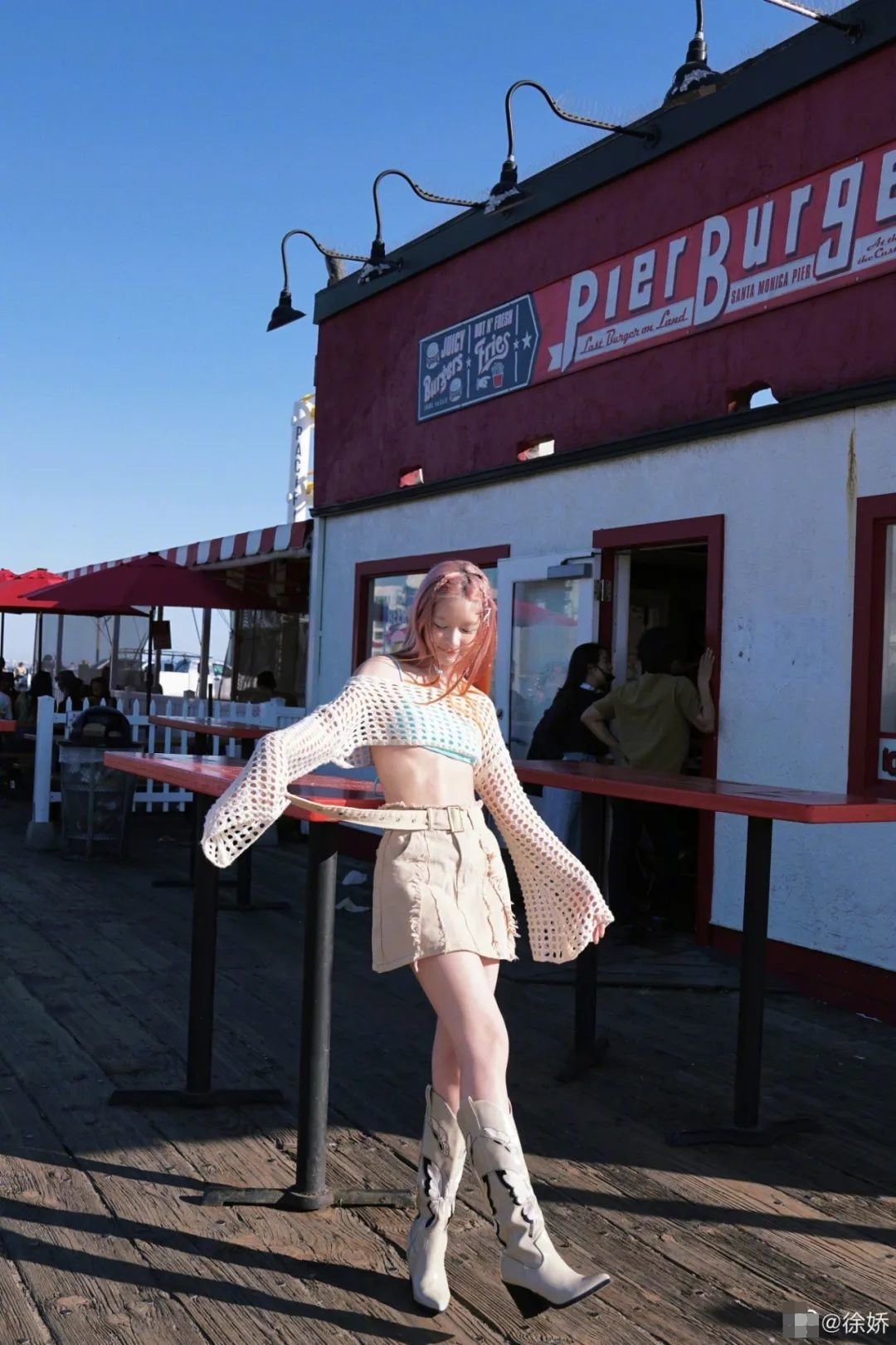 圣塔莫妮卡是洛杉矶附近著名的沙滩,风景宜人还有色彩鲜亮的游乐园,是不少美少女的出片好去处。在市区玩耍的时候,徐娇在这套造型之外套上了半裙,辣妹风十足。这也是很多人在海边玩耍时的常备"省事技巧"--脱掉外衣、下装,就能潇洒地在沙滩上晒黑皮了。