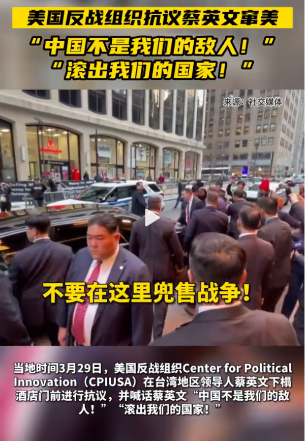 据环球网报道,蔡英文刚抵达在美国下榻的酒店时,美国反战组织CPIUSA一行人就在酒店门前拉起了横幅并进行抗议。期间,这些反战人士喊出了"中国不是我们的敌人"、"不要在这里兜售战争"和"滚出我们的国家"等口号,场面一度颇为热闹。不知道蔡英文一行人在屋里听着外面传来的一浪浪呼声,会不会觉得有点不自在。