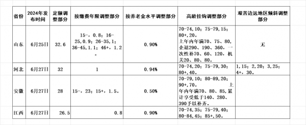 今年的养老金调整方案公布的非常迅速。6月17日全国退休人员基本养老金调整通知公布,紧接着在6月25日山东省就公布了2024年的养老金调整细则。6月27日,河北省、安徽省、江西省三个省份又连续公布了当地的养老金调整方案。
