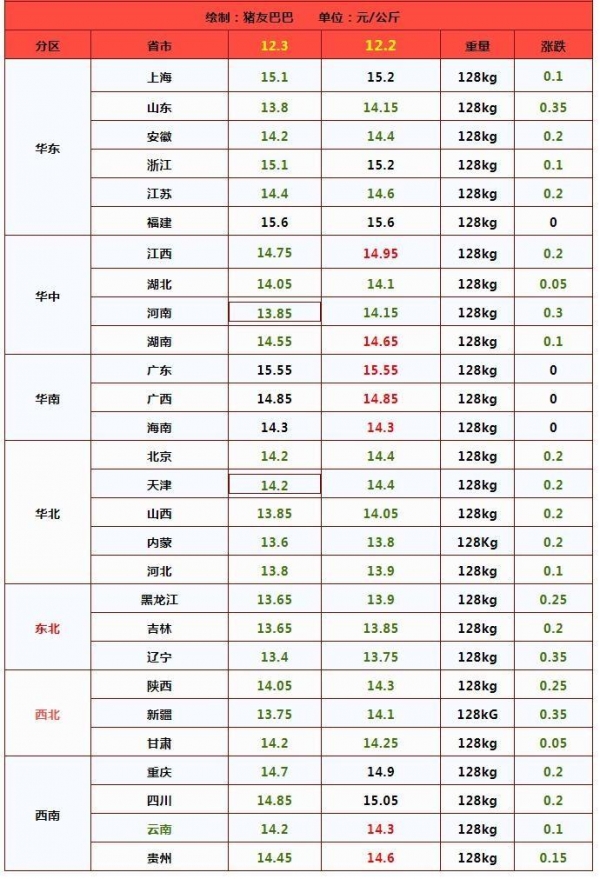 而在南方一带,生猪普遍在14元/kg以上,如华东地区除山东外猪价为14.2-15.6元/kg;华中一带除河南外猪价为14.05-14.75元/kg;华南一带行情稳定,猪价为14.3-15.55元/kg;西南跌了0.1-0.2元,猪价为14.2-14.85元/kg。