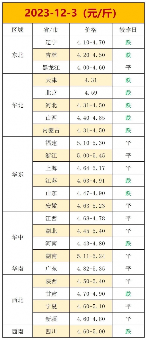 然而,近期鸡蛋行情开始了一波下跌,山东地区已回落至4.47-4.9元/斤,吉林跌至4.2-4.5元/斤,河北跌至4.31-4.5元/斤,京津跌至4.31-4.59元/斤,河南跌至4.43-4.8元/斤。