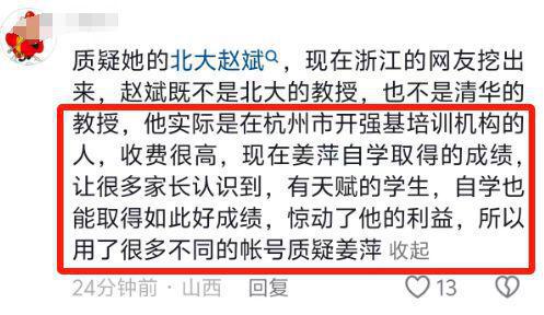 现今,赵斌经营着一家强基培训中心,有网友质疑,姜萍这种天赋型选手的出现,可能动摇了家长对赵斌培训效果的信心,进而影响了他的利益。