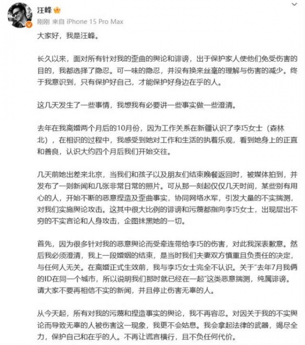 要知道汪峰和章子怡离婚的事情发生后,很多人就在猜测是汪峰的问题。后来被拍到带着新女友回家,不少人更是直接怀疑汪峰和章子怡的离婚,是因为汪峰婚内出轨所致。不过这些事情只是网友的猜测,也没有实锤过。然而,随着汪峰和森林北官宣恋情,网友们却在其中发现端倪。