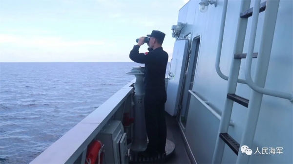 阿坝舰官兵观察海上情况 潘跃强 摄