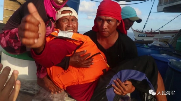 当日上午8时许,菲律宾一艘小渔船在脱离母船开展捕鱼作业时,1名渔民左脚不慎被螺旋桨打伤,血流不止。由于渔船吨位小、速度慢,短时间内无法返回母船,在经过6个小时的求救后,当日下午2时许,菲渔船看到中国海军巡逻军舰。其中1名渔民不断挥舞手臂、大声求救,中国海军阿坝舰在判明情况后,迅速向渔船靠近并使用挂梯,将伤者转运上舰进行紧急救助。