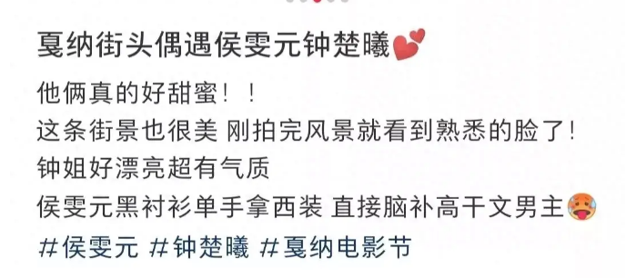 5月19日,有网友发帖称在戛纳街头偶遇到了钟楚曦侯雯元这对情侣,还分享了一组他们在街头上一路说笑,以及相拥的甜蜜照片,看到这样齁甜的两人,该网友都忍不住直呼他俩真的好甜蜜呀!
