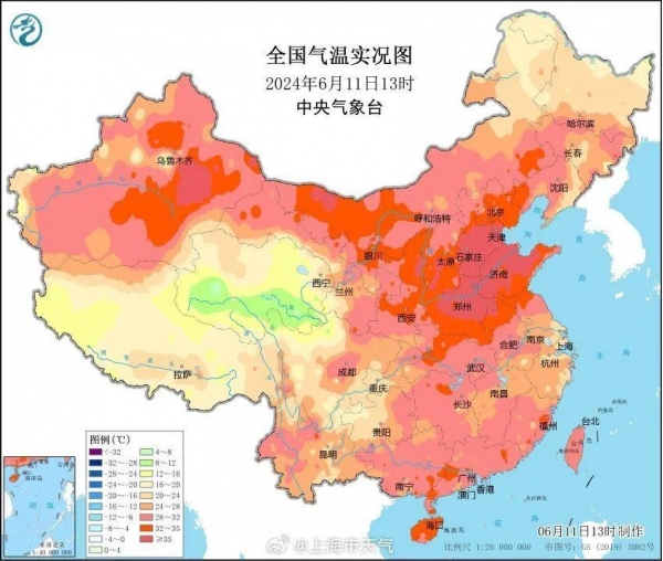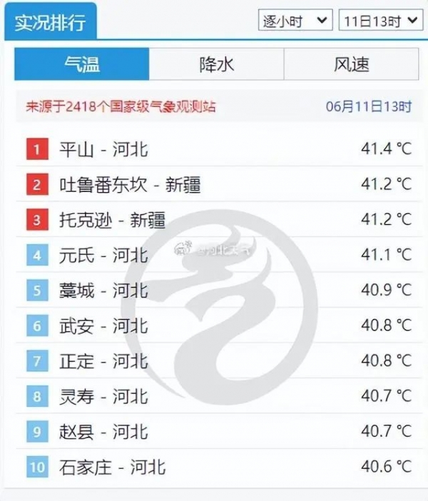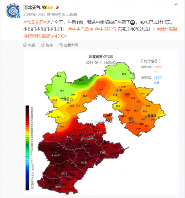 昨天(10日)开始,北方继续出现大范围高温天气,河北中部、山东西北部、新疆吐鲁番等局地气温达40℃~43.3℃,山东、河北、天津、江苏有27个国家气象观测站日最高气温突破6月上旬极值。