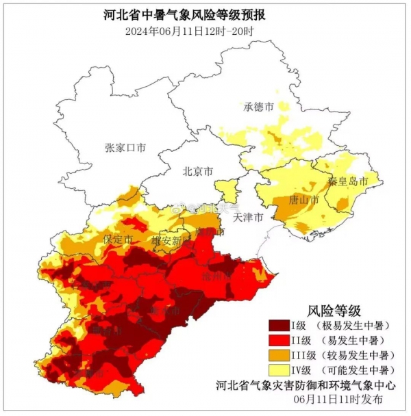 河北省气象灾害防御和环境气象中心 2024 年 6 月 11 日 11时发布中暑气象风险等级预报:6月11日下午,保定、廊坊及以南大部分地区中暑气象风险等级为Ⅲ级及以上,较易发生中暑,其中,保定南部、衡水大部、邢台中东部以及石家庄、沧州、邯郸三市的部分地区中暑气象风险等级为Ⅰ级,极易发生中暑,请注意防范。