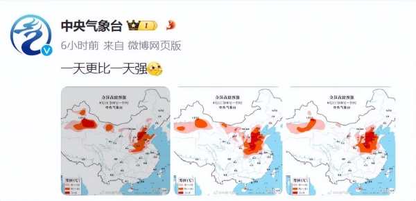 预计11日至14日,华北、黄淮、苏皖北部、湖北西部和北部、陕西、内蒙古西部和东南部、新疆盆地地区等地日最高气温在35摄氏度以上,河北中南部、河南中北部、山东西北部和中部等地部分地区可达40-42摄氏度;其间,河北、河南、山西、山东等地部分地区的日最高气温可达到或突破历史同期极值。