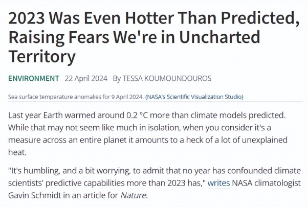 同时,来自《自然》杂志也发表了一篇文章指出,2023年气温甚至比预期更热,人类担心正处于未知领域,2024年如果继续这样,可怕的局面可能会继续,那究竟是怎么回事呢?
