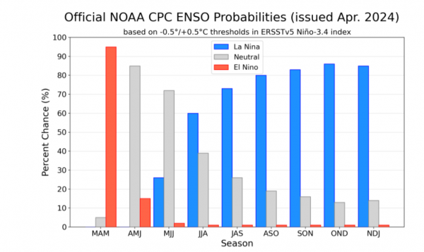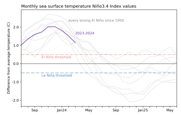 根据NOAA在4月发布新一轮数据来看,通过对衡量厄尔尼诺-南方涛动 (ENSO) 的主要指标监测情况来看,自厄尔尼诺现象在 2023 年11月至 12月达到约2.0 °C的峰值以来,这一异常值是在一直稳步下降,这意味着它的减弱消失。