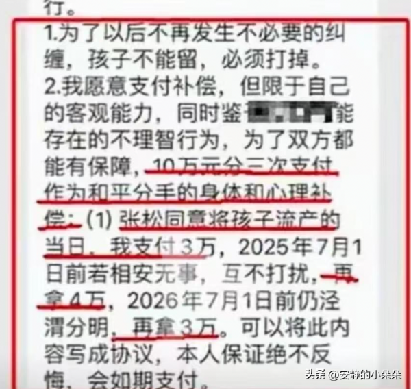 "你流产后,我先给你3万元。25年7月之前我们都相安无事的话,我再给你4万元。26年7月再给你3万。"