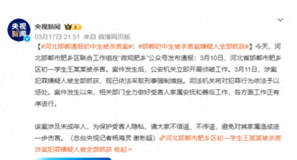 2024年3月10日,河北省邯郸市肥乡区13岁初中生遭同学杀害,因手段残忍,性质恶劣,加上是未成年人所为,引发了舆论广泛关注。