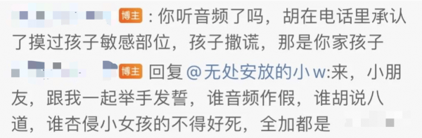 录音中一位疑似女孩母亲的女士质问"半只狐狸"是否真的对孩子动手动脚,他前期一直否认,不承认侵犯儿童,直到后面6分半的时候才承认摸了女孩的胸部。