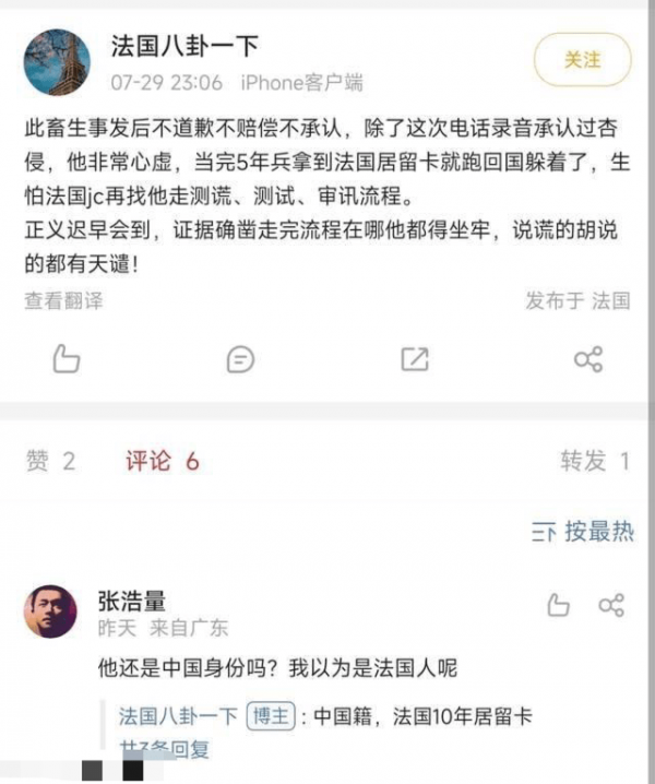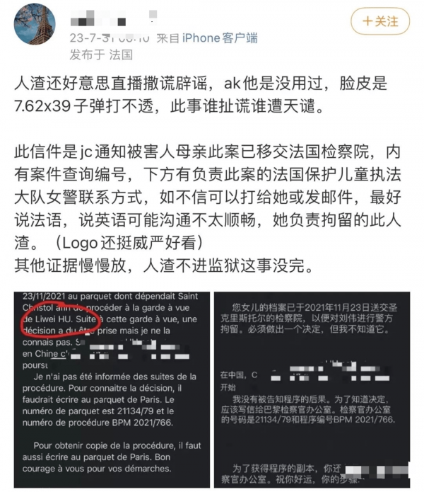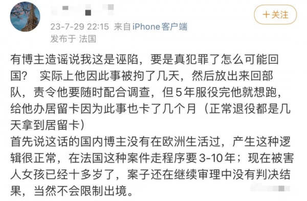 但对于这份爆料很多网友都表示怀疑:要是真犯罪了是不可能回国的吧?还有博主直接斥责该爆料者是诬陷。对此爆料着也做出了相应的解释,他说:在法国这种案件走程序一般要3年到10年,虽然现在女孩已经十多岁了,但案子还在继续审理中没有判决结果,所以不会限制他出境。