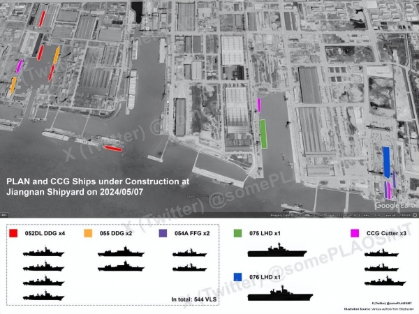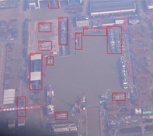 根据图片显示,画面中,包含有4艘052DL驱逐舰以及两艘055万吨大型驱逐舰,除此之外,还各有一艘075和076型两栖攻击舰正在建造。