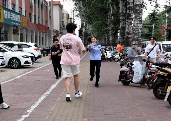 接到求助后,民警一边安慰家长和考生,一边详细询问家校路线,并向指挥中心报备。同时,民警骑车带着考生,沿着回家的路线仔细寻找。最终,在考生家楼下停放的共享单车的篓里,找到了遗失的准考证和身份证。