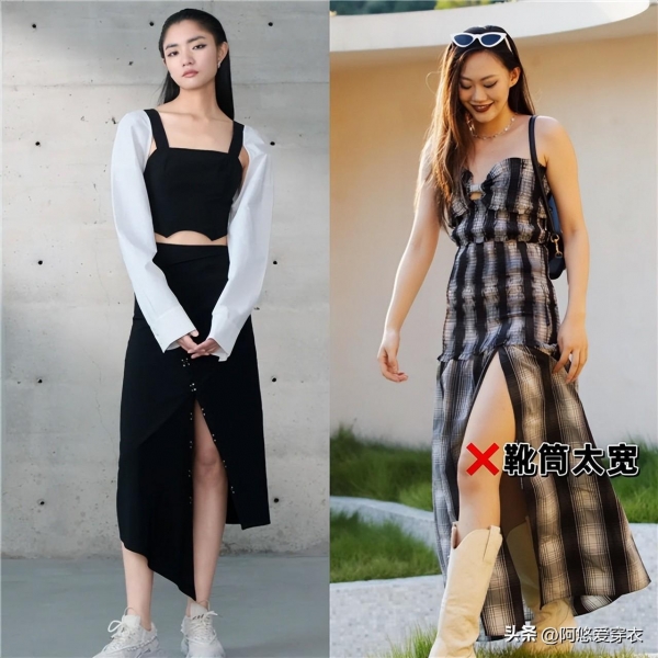 比如说这种长筒靴,再搭配上一条长款的剪刀裙,由于靴子把我们的腿部肌肤都遮挡住,这样就会降低下半身的露肤度,并且显得很局促拥挤,如果靴筒太宽松,也容易拉宽腿围。