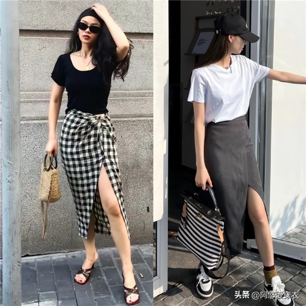 另外从剪刀裙的设计来看,我们也可以去选择不同的花色,比如说追求百搭的女生会选纯色的剪刀裙,相对更日常,但追求个性的女生就会更喜欢这种时尚的格纹开叉裙,在裙子上融入这种时髦的元素,就像这种黑白色的格纹,低调大方,而且也能增强设计感,又不会觉得花纹太夸张。