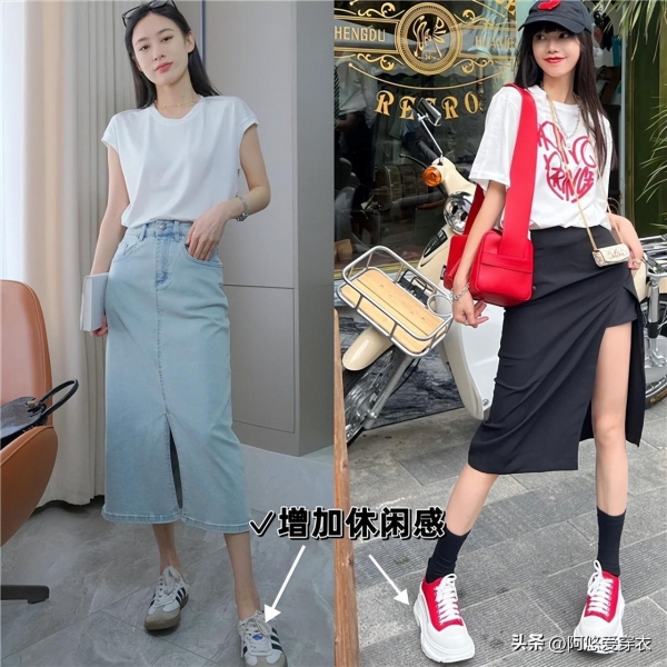 比如说你搭配的鞋子可以选这种帆布鞋,或者是小白鞋,这样的搭配就能够和裙子风格形成明显的反差感,让休闲和性感相互对比。