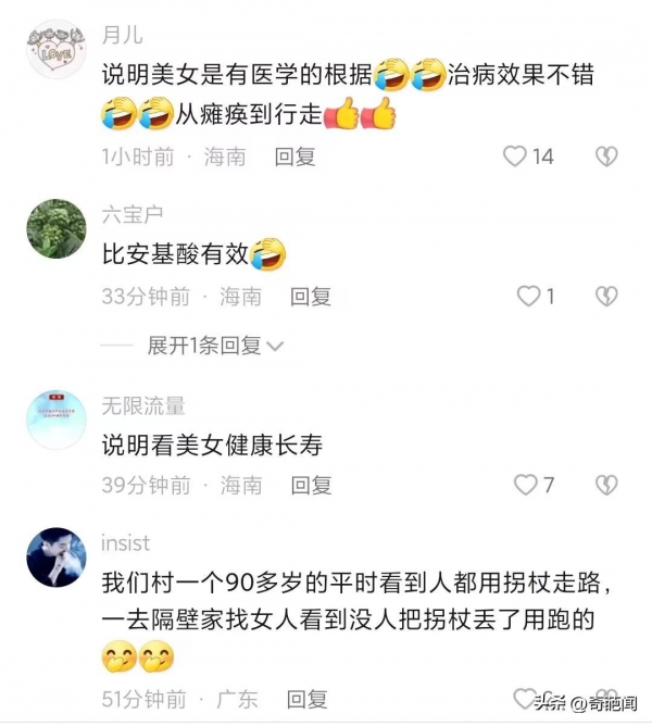 有网友评论说,这药效太神奇了,瘫痪多年的大爷见到美女不治而愈。