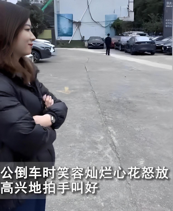 粉衣女子在男子倒车的同时,在一旁观察指挥,并且不停地拍手叫好,连声夸赞男子开车技术好,这倒车技术也是溜溜地,一级棒。