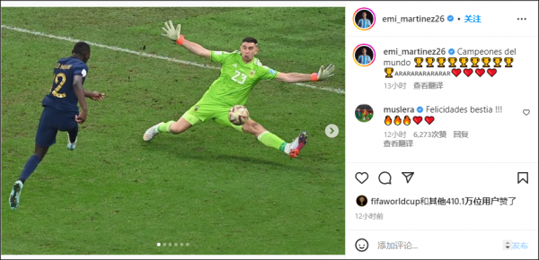 马丁内斯Ins晒出自己挡下穆阿尼单刀瞬间