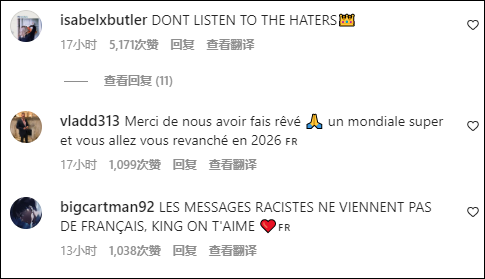 还有法国球迷撇清道:"种族歧视的信息都不是法语,我们爱你。"