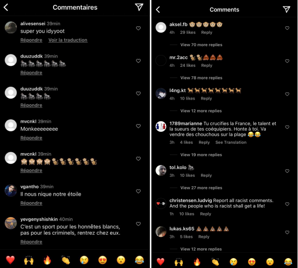 赛后,错失绝杀单刀的穆阿尼和罚丢点球的科曼、琼阿梅尼遭到网暴,他们的个人社交媒体Instagram评论区出现了大量的辱骂言论,"蠢货""黑鬼(niggas)""你不配当法国人"……此外,猩猩、猴子、香蕉这些明显种族歧视的表情符号也在他们的评论区刷屏。
