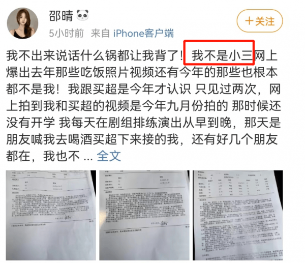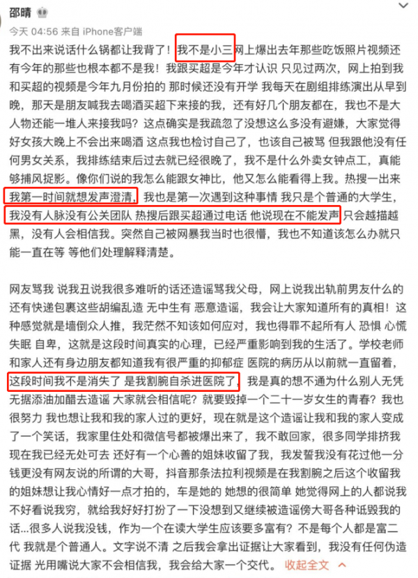 邵晴的这份澄清字数很多,内容也相当精彩。总结下来就是:我不是小三,只跟买超见过两面,被曝光后想过澄清,却被买超拦下来了。消失的这一段时间,遭受了网络暴力,我抑郁了也割腕了,现在给大家一个交代。