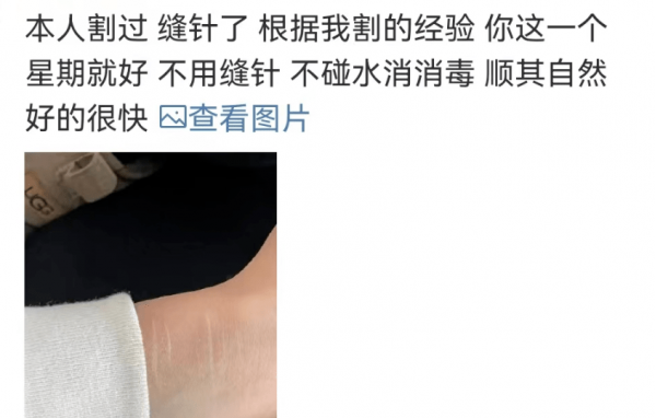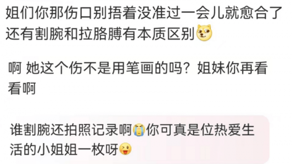 有过割腕经历的网友直言不讳:你这伤口一个星期就好了,都不用缝针。更有网友大胆猜测,她这整齐的伤口是用笔画的,毕竟谁割了腕之后还会拍照啊。