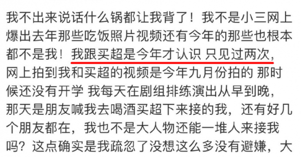 她开头就否认了狗仔视频里拍到的不是她,跟买超没有男女关系,但下面全是对曝光视频的描述。